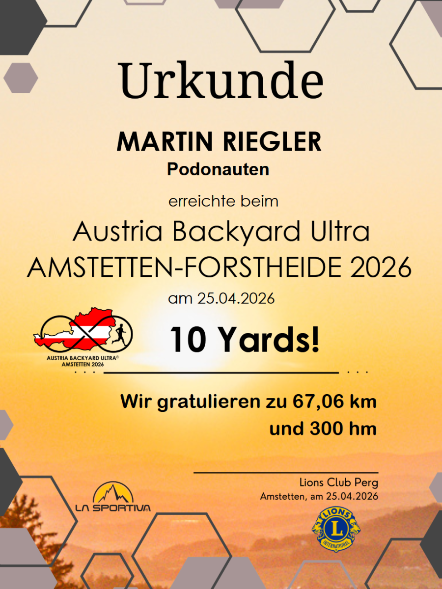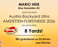 wurde in einer traumhaften Waldlandschaft in Amstetten eröffnet. Am Samstag, 25. April 2026 um 9 Uhr starteten ca. 230 Ultra Läufer und Läuferinnen in den Bewerb. Start und Ziel war beim Stadion in Hausmening, die Strecke führte in die Forstheide und wieder zurück. Auch die Sonne war den ganzen Tag über Begleiter der Sportler und Sportlerinnen. In der Nacht wurde mit Stirnlampe und Warnweste gelaufen.Der Modus des Backyard Ultra ist ganz einfach: Zu jeder Stunde starten die LäuferInnen in eine 6,706 km (=4,167 Meilen) lange Strecke. Dafür hat man exakt eine Stunde Zeit. Wer die Runde nicht rechtzeitig beendet hat und nicht wieder am Start steht ist raus! Kein verspäteter Start! Ganz easy! ;-)